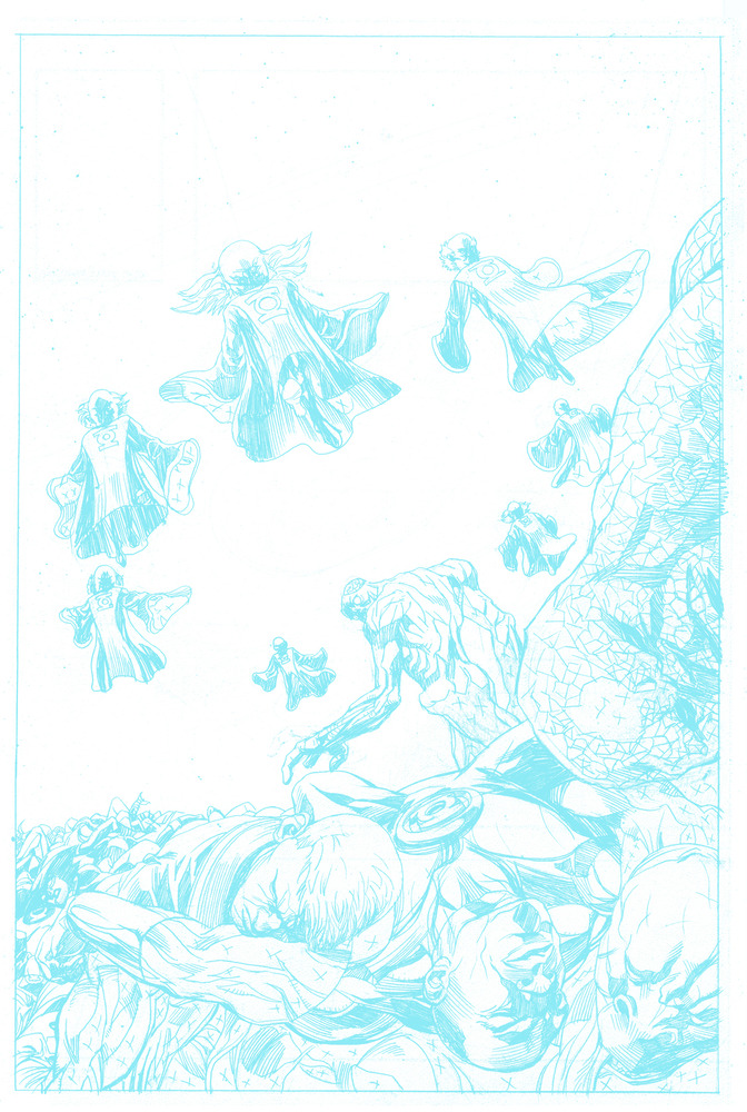 Whatever amount of layers it takes to make that happen.. like in the images below, i created a storm in the space firmament and put some cool burst effects on top of it and popped that “screen” mode to really marry the images. Then it was a bunch of carving out the images around the drawn figures, but when it was done… over the blue lines, i collapsed it and printed it out on legal 11×17 art board with DC guides in blueline and black and white sfx.
