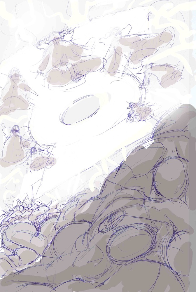 FOUR: MY PROCESS: i draw the accepted thumbnail and flesh out the cover in blue pencil. It’s the necessary process that i love but inkers hate. Nothing ticks them off more than having to erase blue waxy material off after they’ve done fine inking. I solved that in later steps. After i blue it on the paper, i go back in and hit it with the 2H. All the linework, all the line thin to thicknesses, all the shadowing goes into this stage. And since i’m inking i don’t care what i do, i can always fix it in Photoshop. So that’s done. Only indications are made to create sfx. Like trees or leaves or ground textures, or energy burst or whatever. That will either be posted on the page in Photoshop after i pencil or after i ink. It all decides on what i need to do.