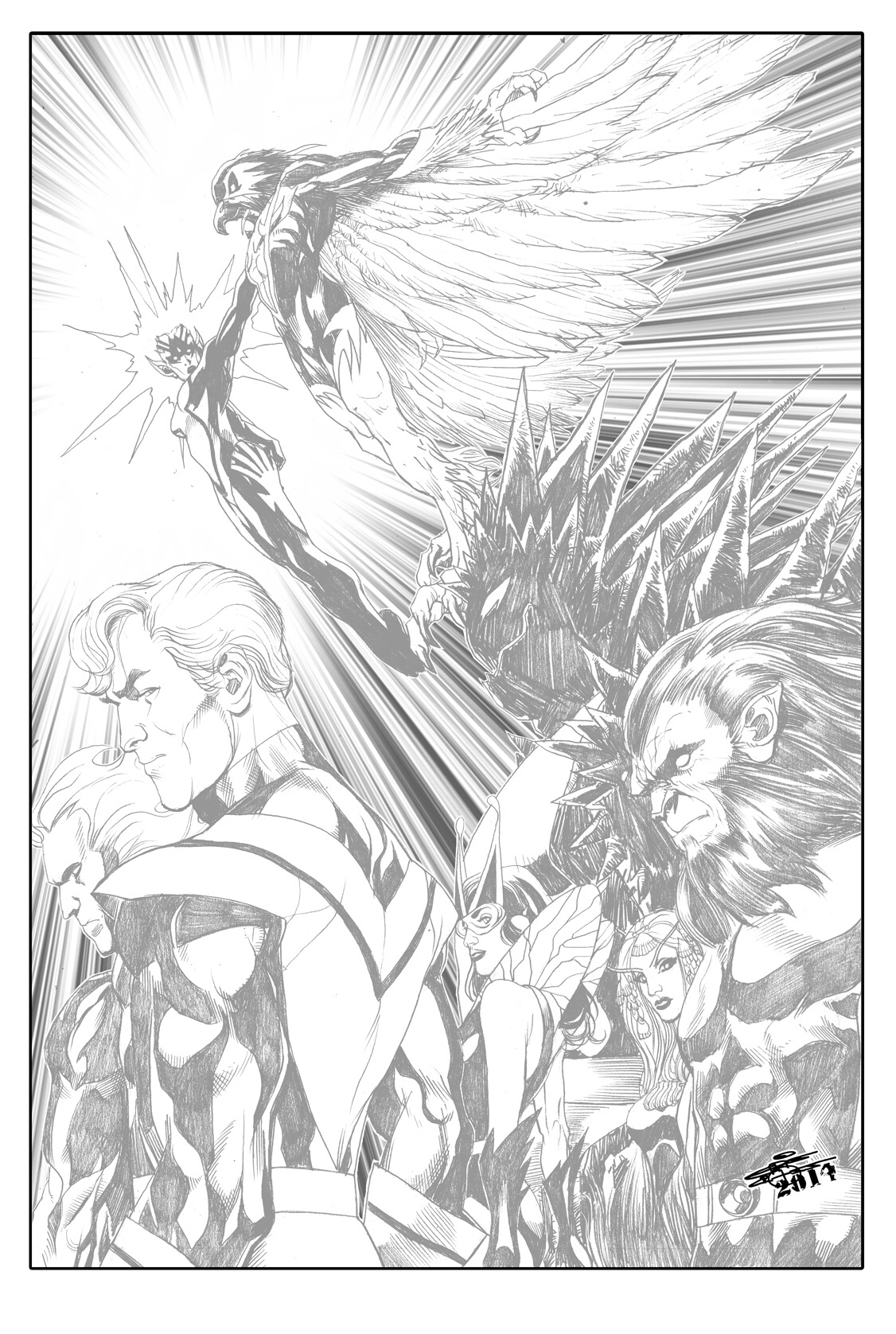 Now, you have to understand I have a bucket list of projects I’ve wanted to work on. SHAZAM! Is one of them. The Futurians are in the high twenties. (Yes… They are numbered in order in my mind. ) and since I’m figuring that they’ve already got someone for the title, I figured I’d donate some art to the cause. I’m usually so busy that I don’t have time to do something like that,so you have to also understand what MOTIVATION means in my visual dictionary. I thought also that I could get Bob Wiacek, a legendary inker in the industry who was/is working on the project, to ink this piece I’m about to repost. Once I finished the art, and sent it to Bob, I couldn’t wait to see his lines on my work. I mean, dude….