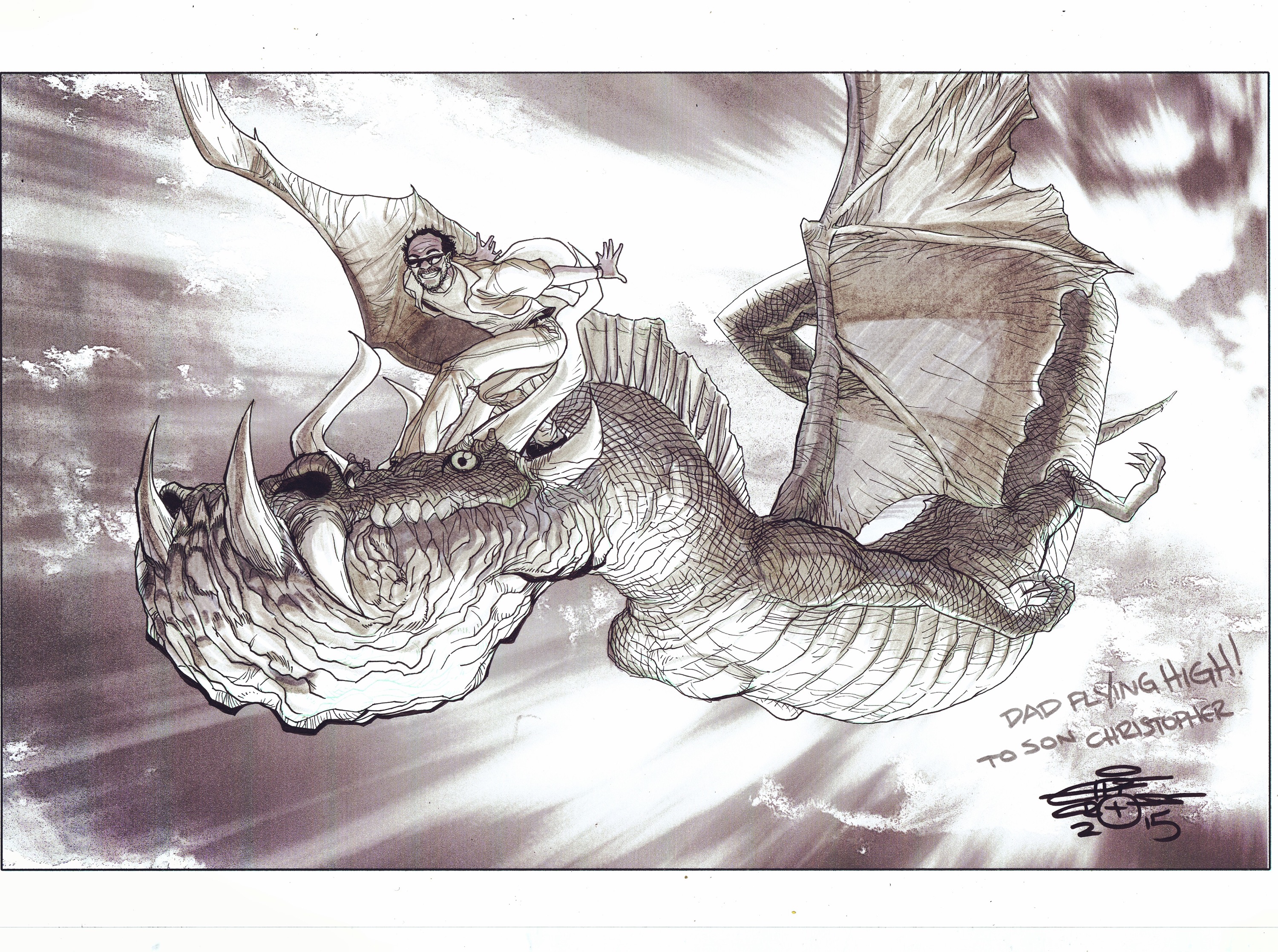 But she told me those that were close to him that Chris enjoyed many things, but one of his obsessions was DRAGONS. They wanted something with him and dragons. So, I thought how coo it would be to surf a dragon to Heaven and Chris’ Father in pure ecstasy enjoying the ride. Make it happy. Make it glorious. It should heal as much as bring closure.