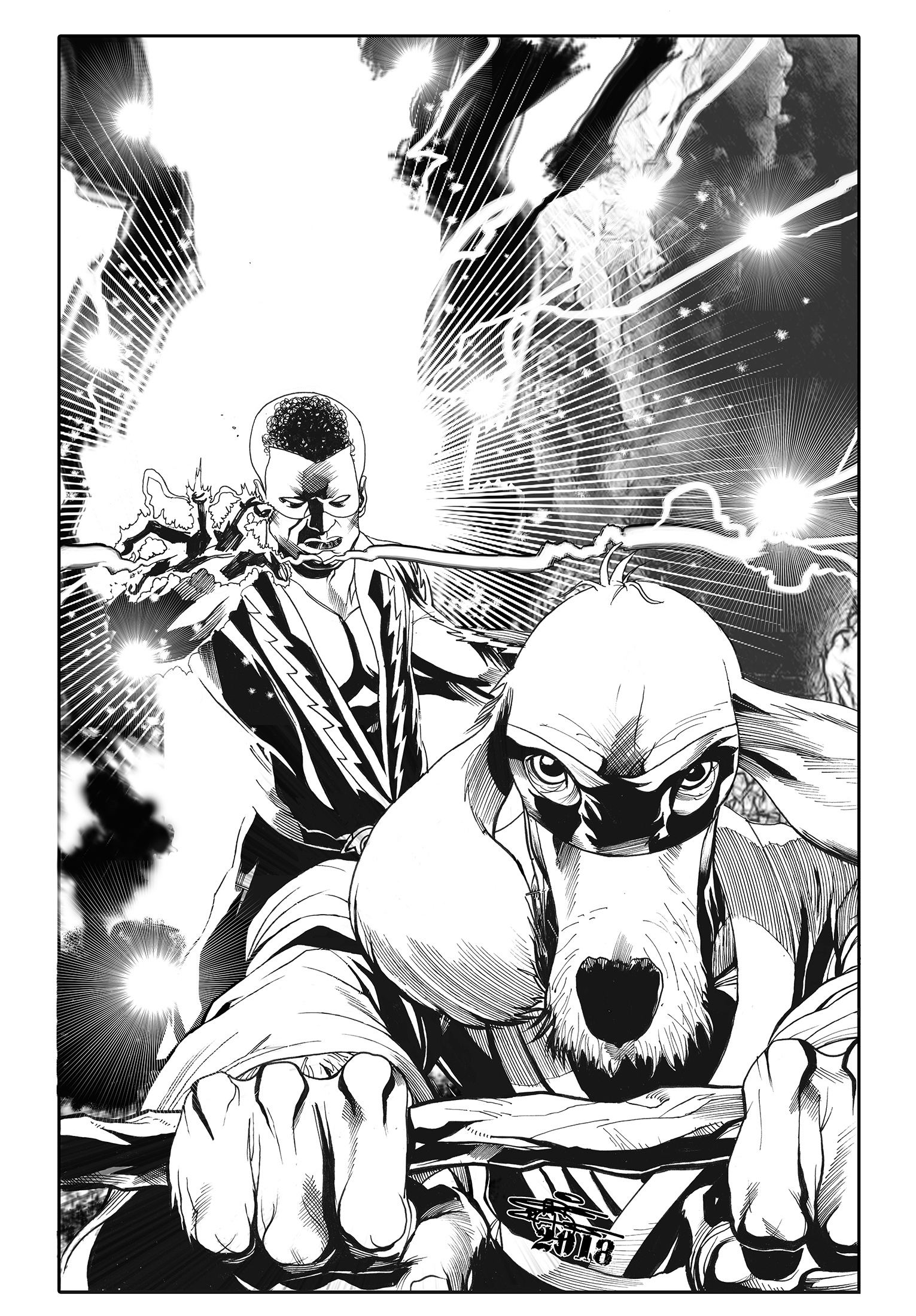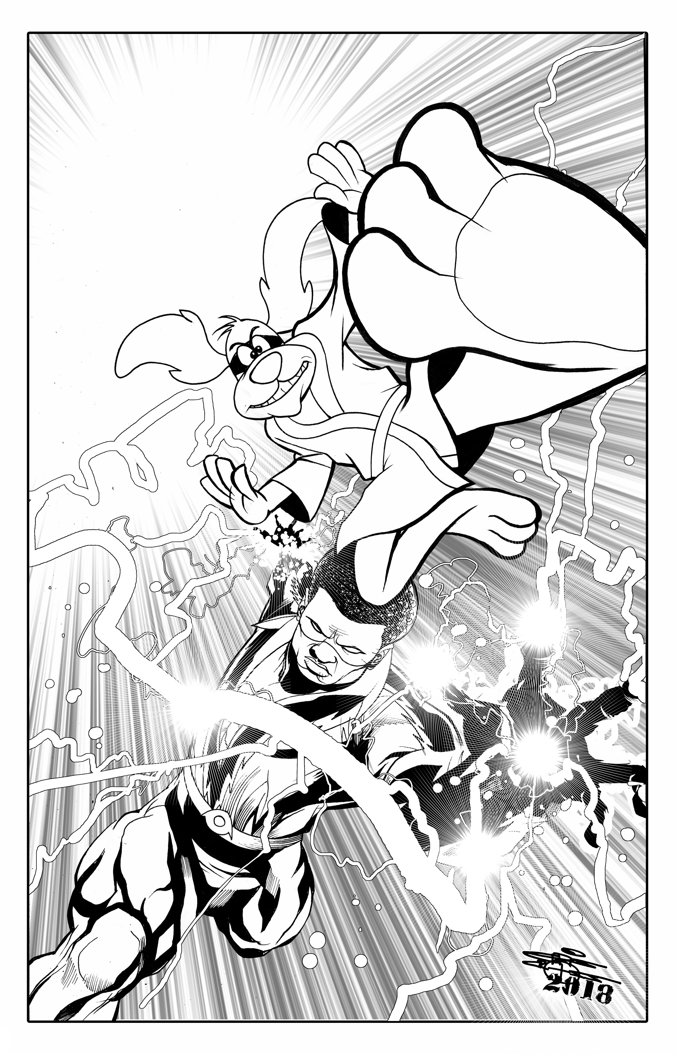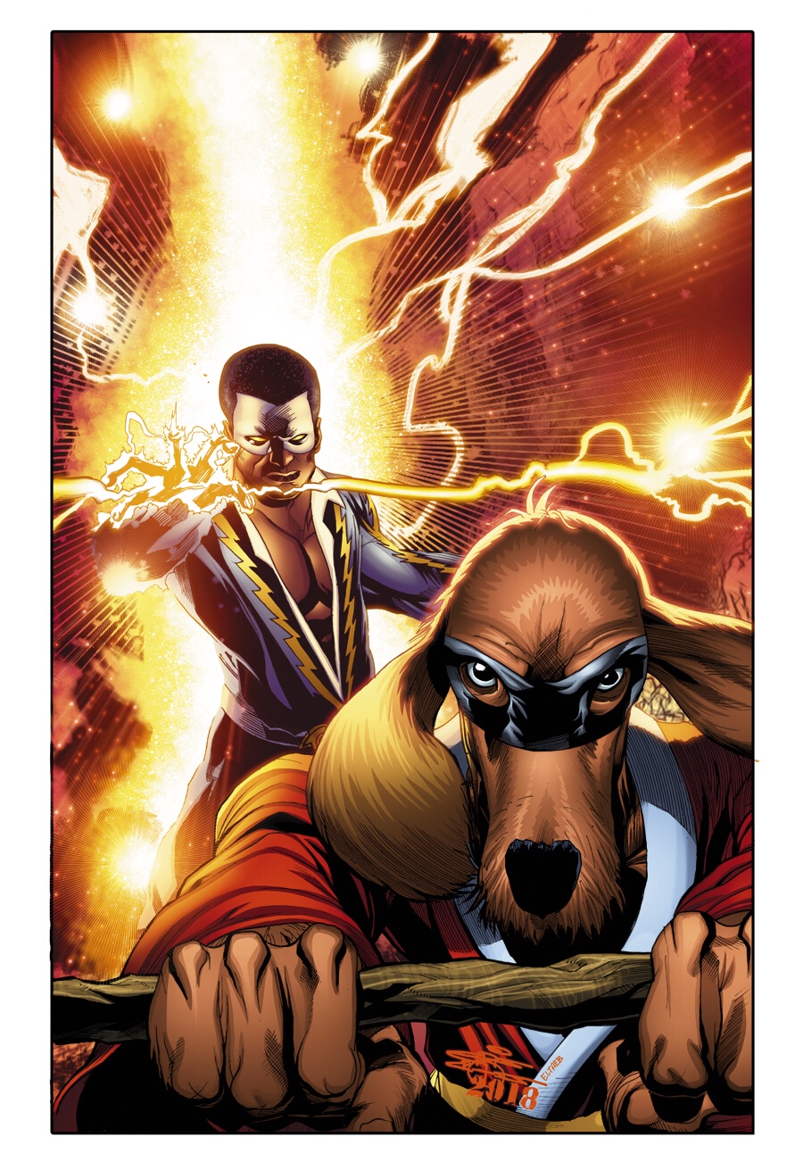 It’s a really odd pairing, I know… having to draw a “realistic superhero ” paired with a known Hanna-Barbera cartoon character, but when I got an email from DC editor Jim Chadwick to do a cover with BLACK LIGHTNING and HONG KONG PHOOEY…. I would be crazy to turn that down! I was in the middle of doing my second book of KINO with Lion Forge , when I got the email, and at the end of the schedule, I took to getting it done. Only they didn’t tell me that I had to morph the cartoon so that in visual concept, HONG KONG PHOOEY looked like he was in the same physical universe as BL. What DC got was THIS…..
